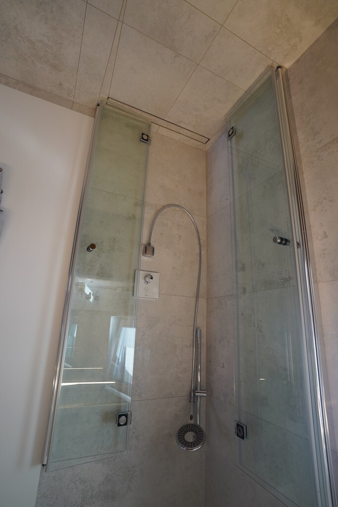 • Łazienka: meble z forniru dębowego na zamówienie, umywalka Laufen, armatura Hansgrohe/Grohe/Kludi, płytki Tubądzin Torano