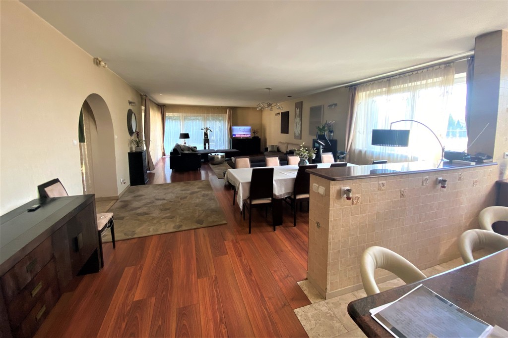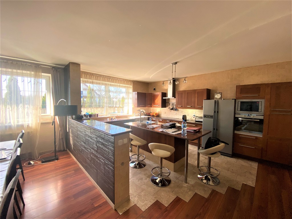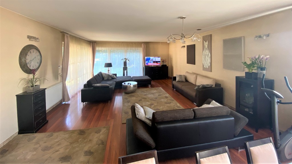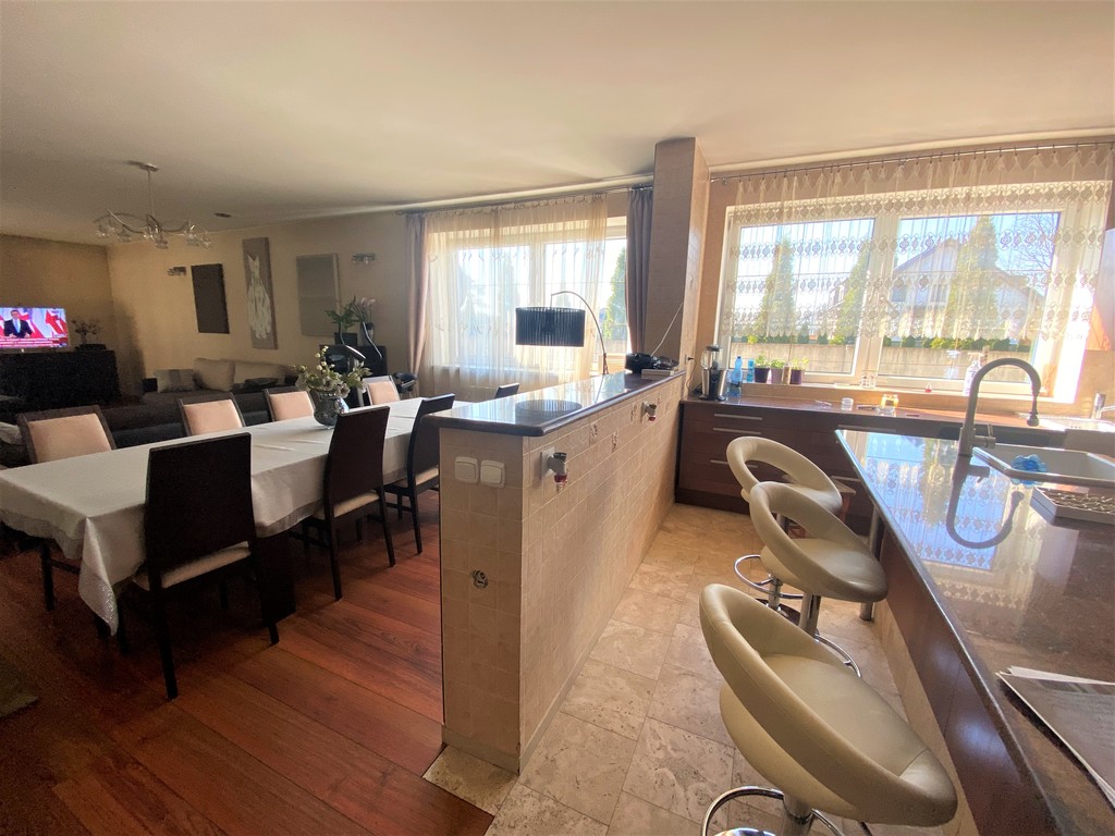 Przestronny salon z bezpośrednim wyjściem na taras i ogród połączony z otwartą, jasną, w pełni umeblowana kuchnią z wyspą kuchenną. Wielkoformatowe okna tarasowe. TARAS zadaszony z wymurowanym kominkiem.