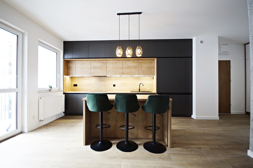 - Nowoczesna kuchnia otwarta z wyspą ok. 6 m2 na podłodze panele winylowe, w pełni wyposażona we wszystkie sprzęty AGD( zmywarka, lodówka, okap, kuchenka elektryczna, płyta grzewcza indukcyjna.