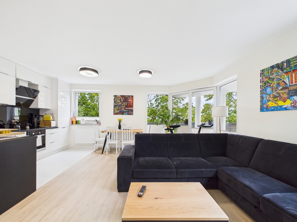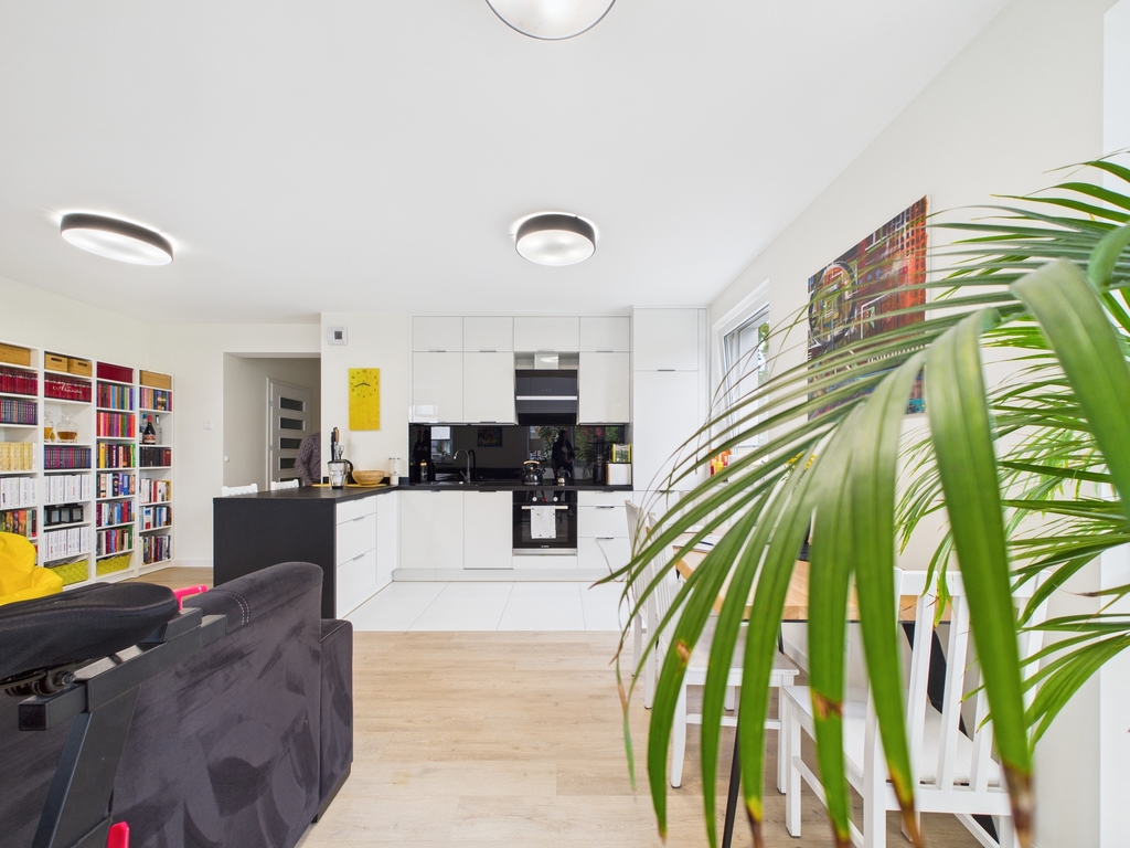 - Jasny, przestronny salon z jadalnią oraz aneksem kuchennym z bezpośrednim wyjściem na taras, z którego mamy widok na zieleń