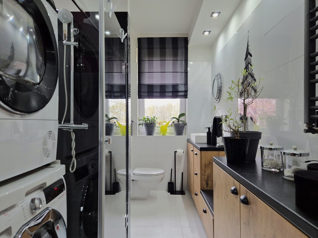 - łazienka z oknem wyposażona w prysznic, WC podtynkowe, osobną pralkę i suszarkę oraz sporo dodatkowego miejsca na przechowywanie w szafkach wokół umywalki