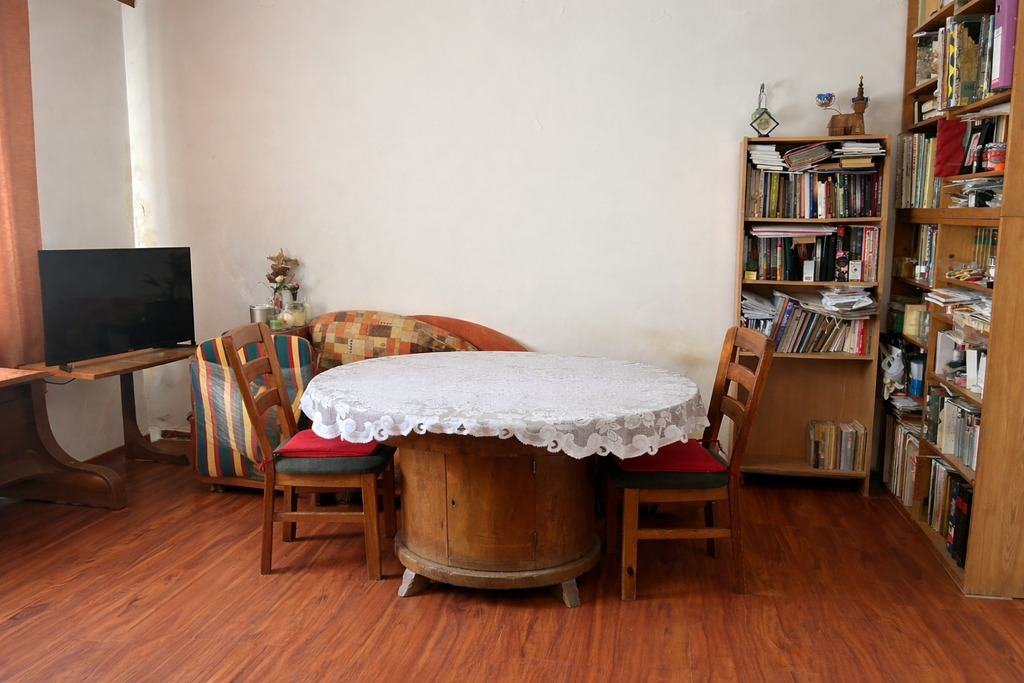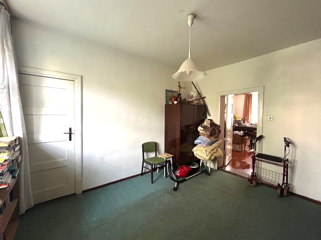 - pokój ok. 13 m2 (od strony ogrodu), połączony drzwiami z pokojem od ulicy ale też i z kuchnią. Na podłodze przedwojenne deski, ściany malowane, okna przedwojenne skrzynkowe