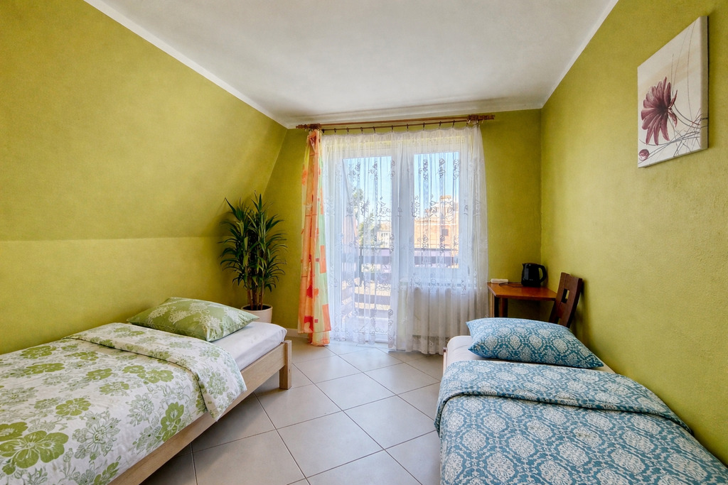 I PIĘTRO: 3 pokoje 3-osobowe z łazienkami i balkonami, 1 pokój 5-osobowy z łazienkami i balkonami, hall.