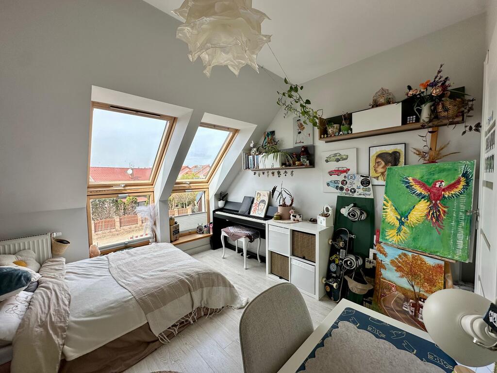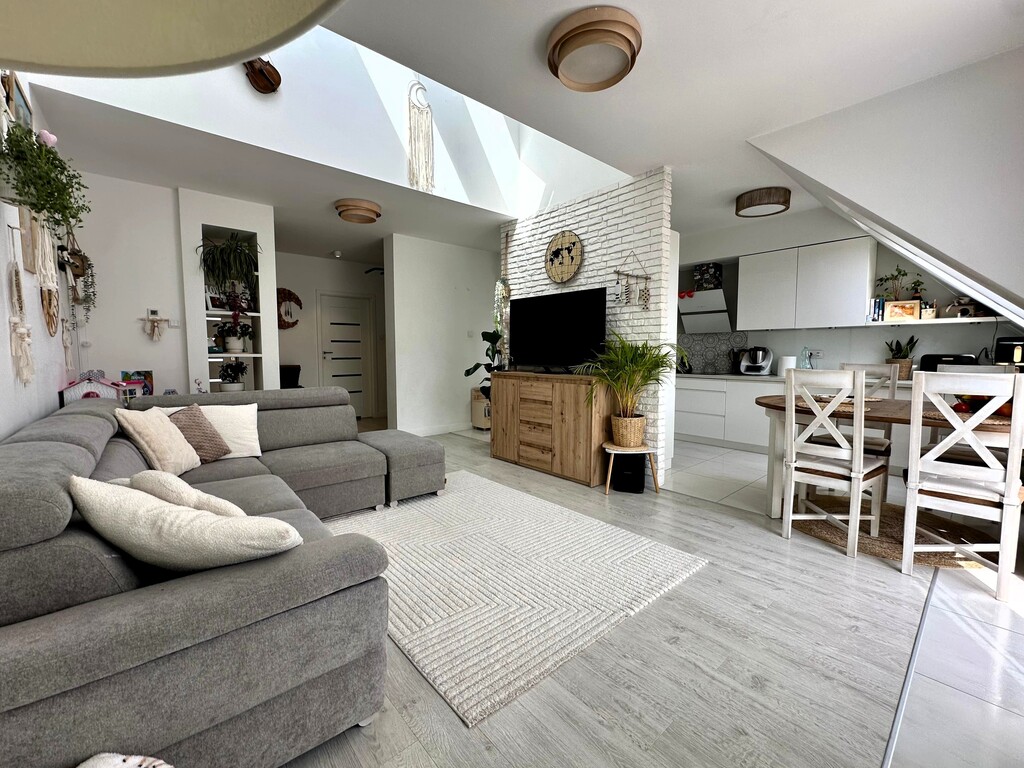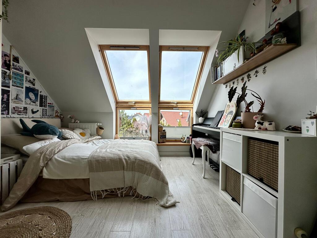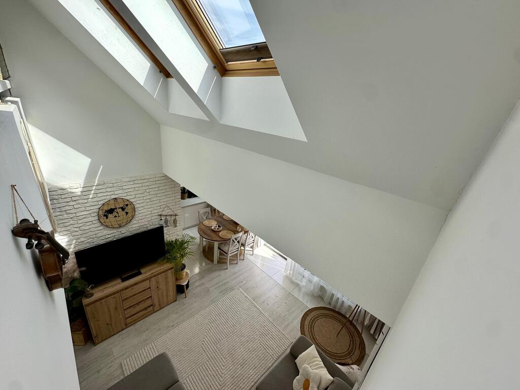 Nieruchomość wyróżnia się niepowtarzalnym układem oraz dużą ilością naturalnego światła. Wysokie sufity w salonie oraz półotwarta antresola z oknami połaciowymi sprawiają, że wnętrze jest niezwykle jasne, przestronne i klimatyczne.