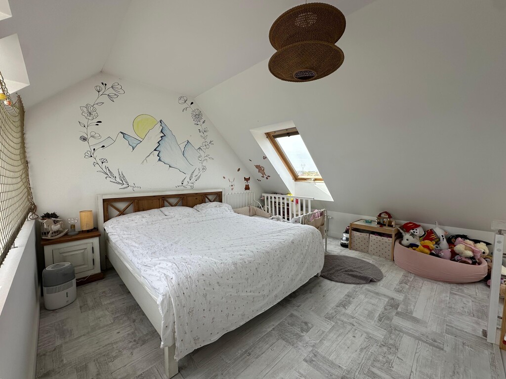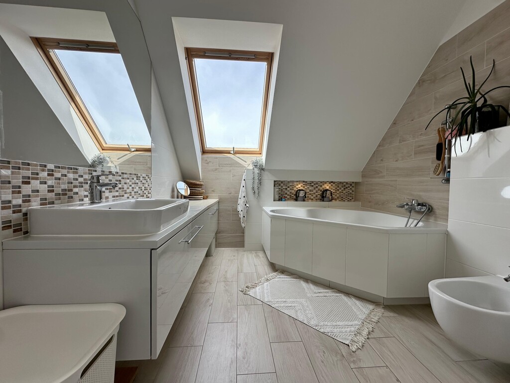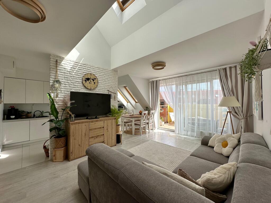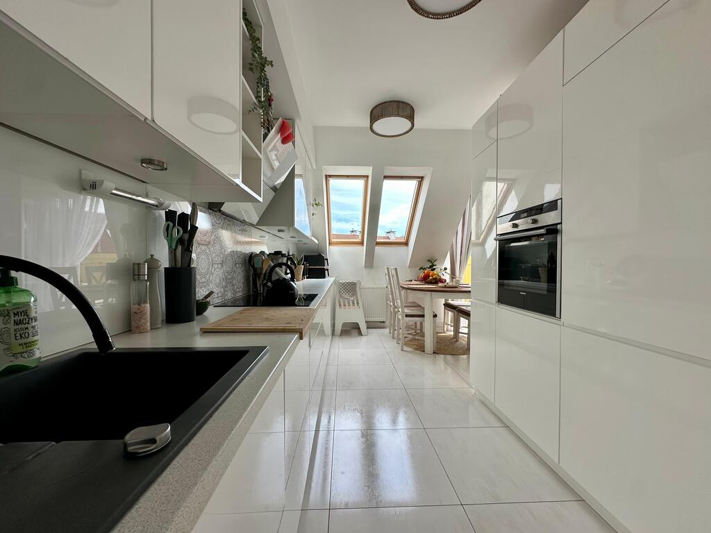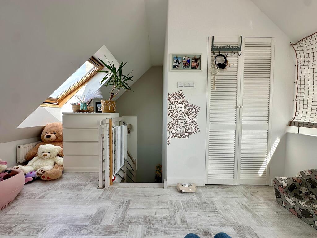 Nieruchomość wyróżnia się niepowtarzalnym układem oraz dużą ilością naturalnego światła. Wysokie sufity w salonie oraz półotwarta antresola z oknami połaciowymi sprawiają, że wnętrze jest niezwykle jasne, przestronne i klimatyczne.
