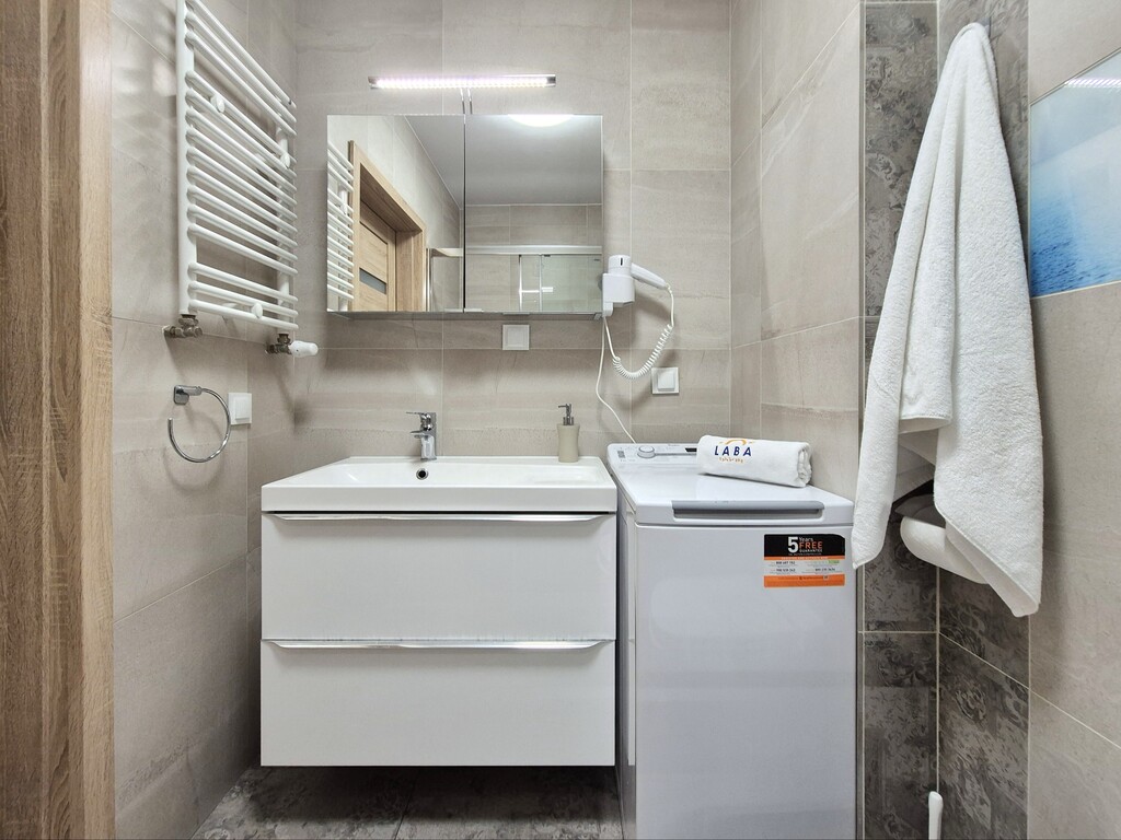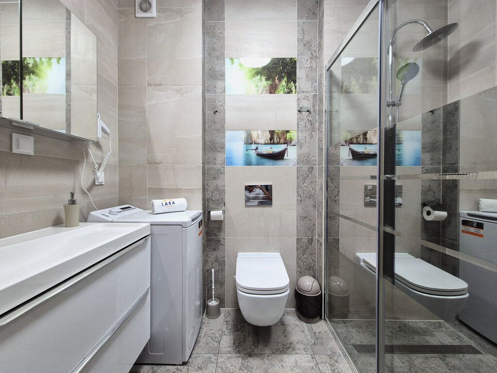 Wyposażona w kabinę prysznicową typu walk-in, podwieszane WC, umywalkę oraz pralkę.