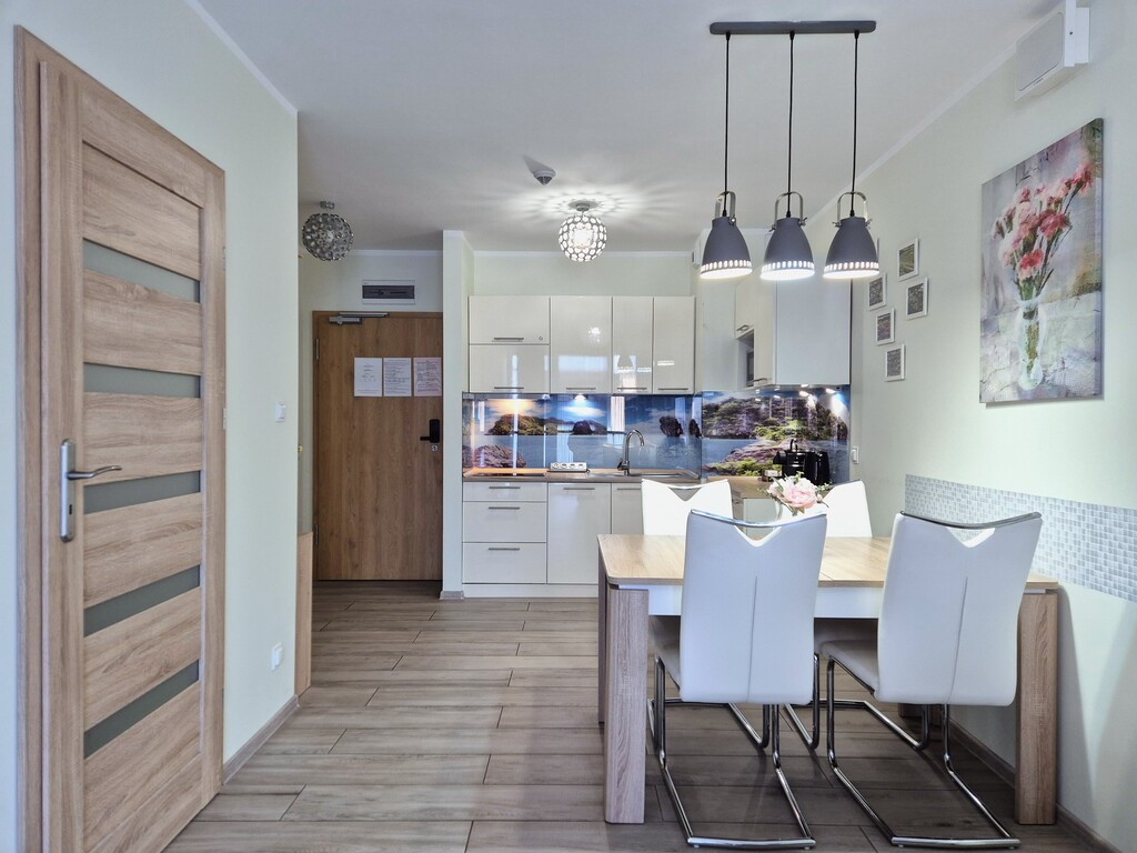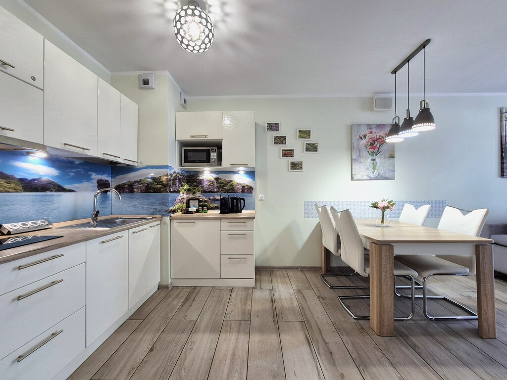 W pełni wyposażony w sprzęt AGD: płytę indukcyjną, piekarnik, lodówkę, zmywarkę oraz kuchenkę mikrofalową, a także podstawowe wyposażenie kuchenne.