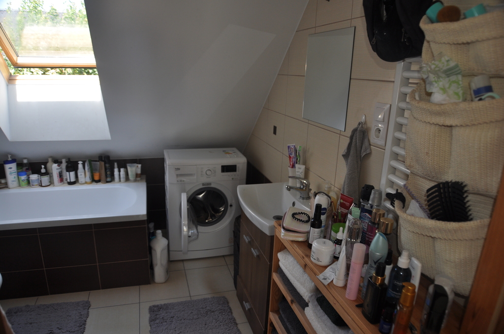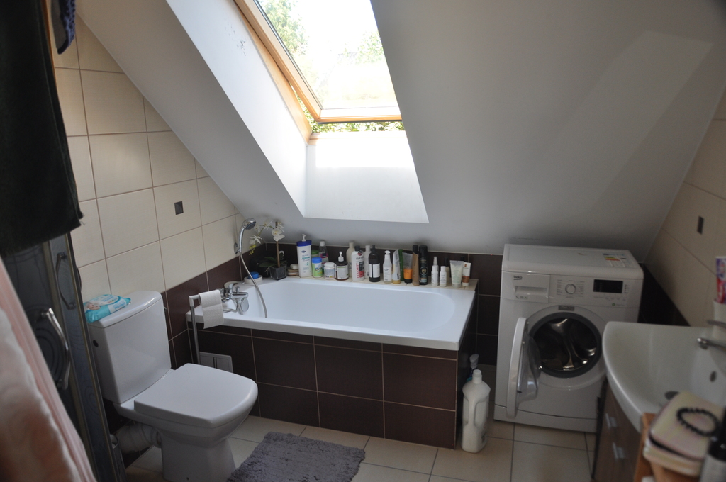 -łazienka z wanną, kabiną prysznicową, umywalką razem z wc (pralka)