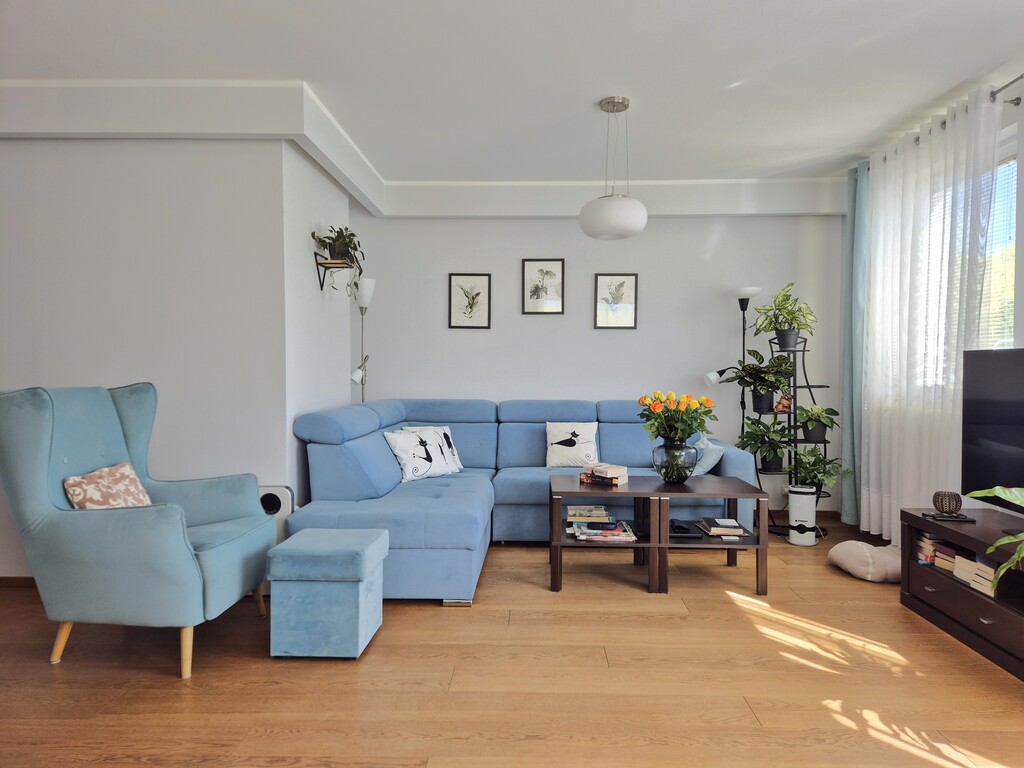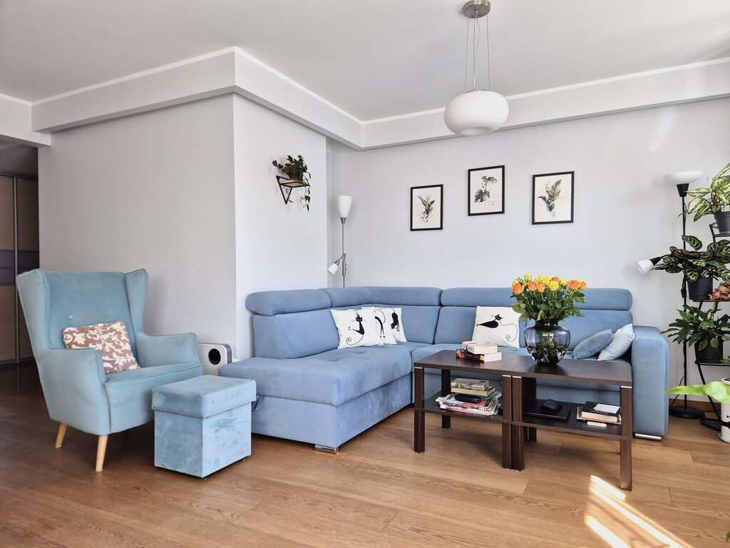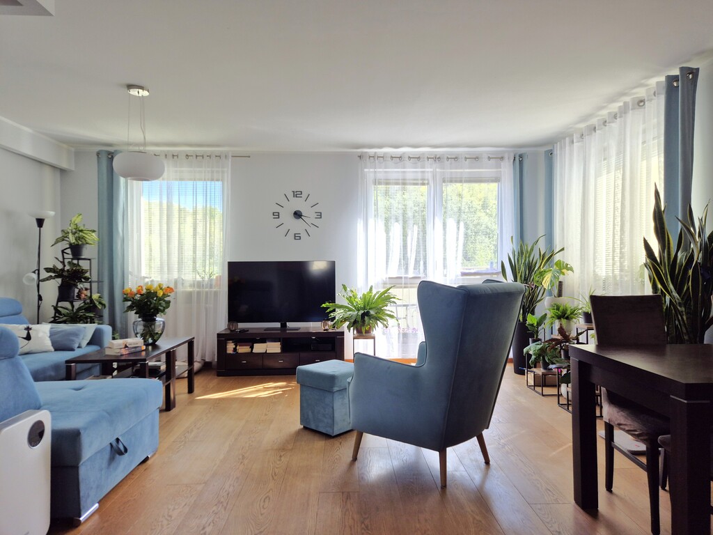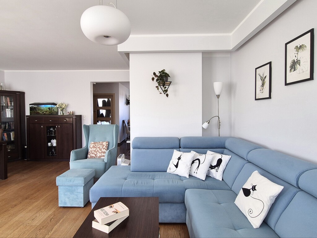 Mieszkanie jest bardzo jasne i słoneczne, ponieważ okna wychodzą na trzy strony świata, dzięki czemu wnętrza są naturalnie doświetlone przez cały dzień.