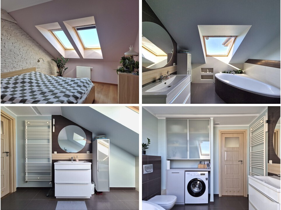 * górny poziom: 3 sypialnie, duża łazienka z wanną i oknem, garderoba
