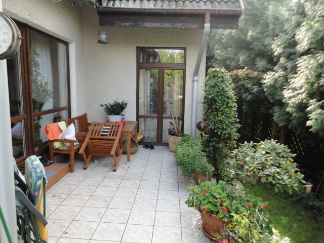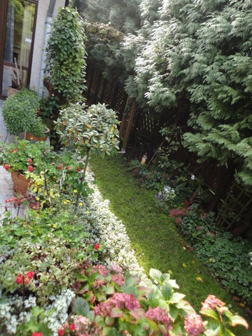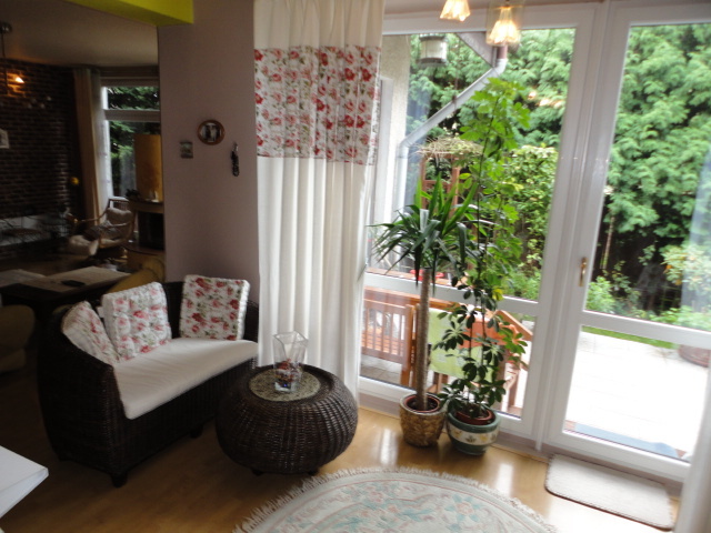 Ogród z pięknymi nasadzeniami i małą ilością trawnika do koszenia. Dom nie wymagający nakładów finansowych.