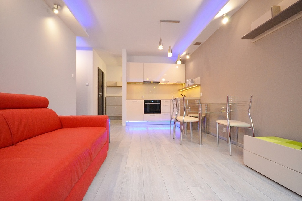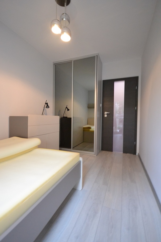 Dwupokojowe mieszkanie w niskim bloku z 2013r. Nowocześnie urządzone, zlokalizowane na IV piętrze w budynku, który został wyposażony w cichobieżną windę i parking podziemny. Mieszkanie posiada pokój z aneksem kuchennym wyposażony w zabudowę stałą z lodówką i zamrażalką Electrolux, płytą ceramiczną i piekarnik Mastercook , zmywarkę Ariston, okap Gorneje. Z pokoju w którym znajduję się wypoczynek, stół + 4 krzesła, tv Samsung. Łazienka wyposażona w kabinę prysznicową, wc umywalkę oraz pralkę Candy. W sypialni znajduję się podwójne łóżko oraz komoda. Mieszkanie wolne do wydania. Datkowe opłaty to czynsz w wysokości 450 zł plus energia elektryczna. Zapraszam na prezentację