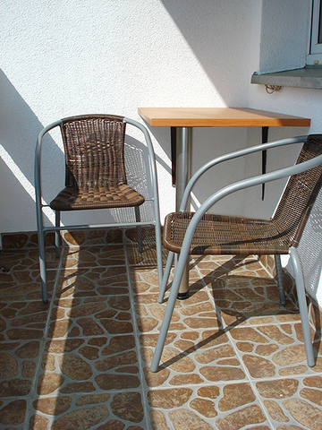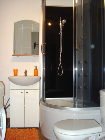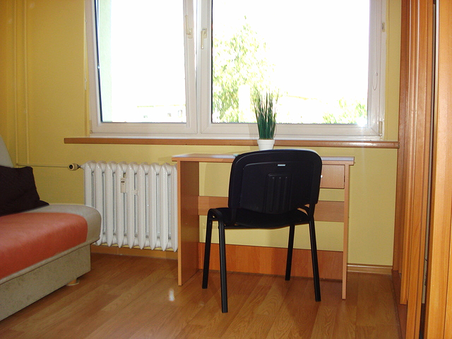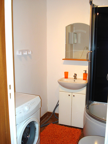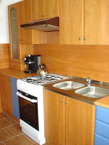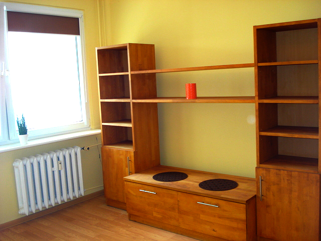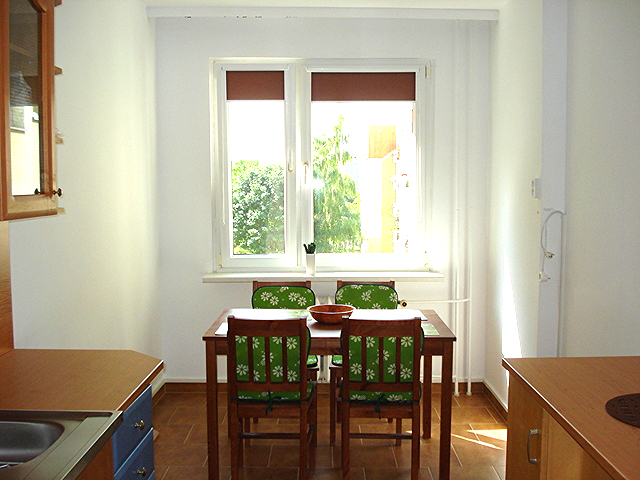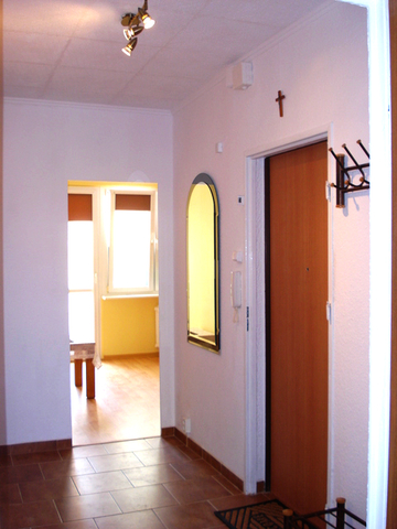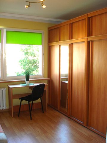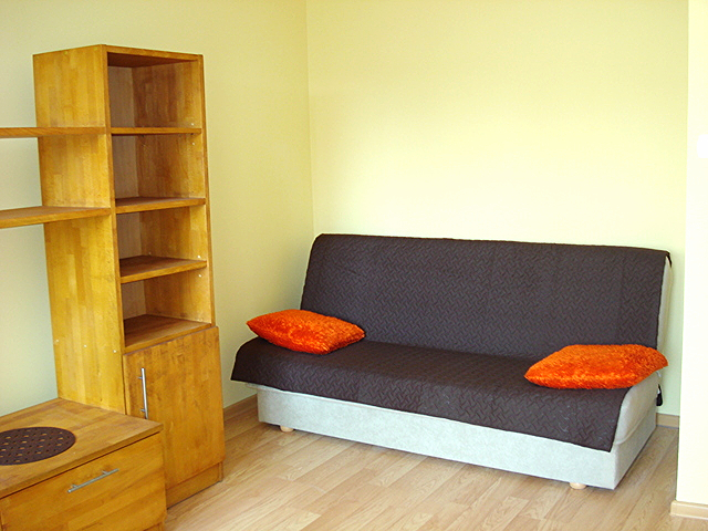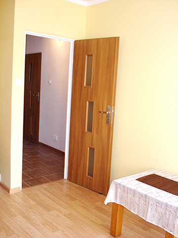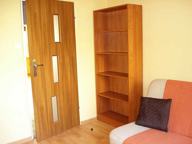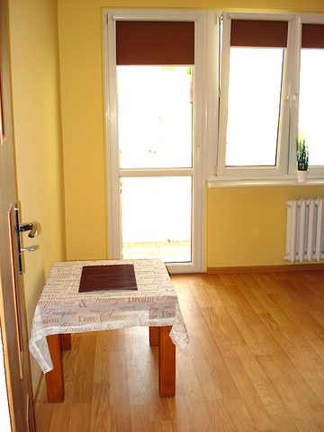 Salon z wyjściem na balkon, kuchnia wyposażona w lodówkę, kuchenkę gazową, stół z czterema krzesłami. Mały pokój z nową kanapą oraz dwiema dużymi szafami. W łazience prysznic, WC, umywalka oraz pralka, na podłodze terakota, na ścianach glazura.