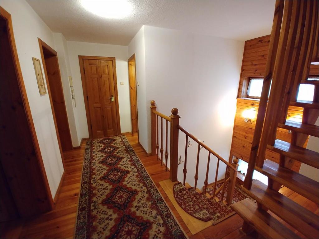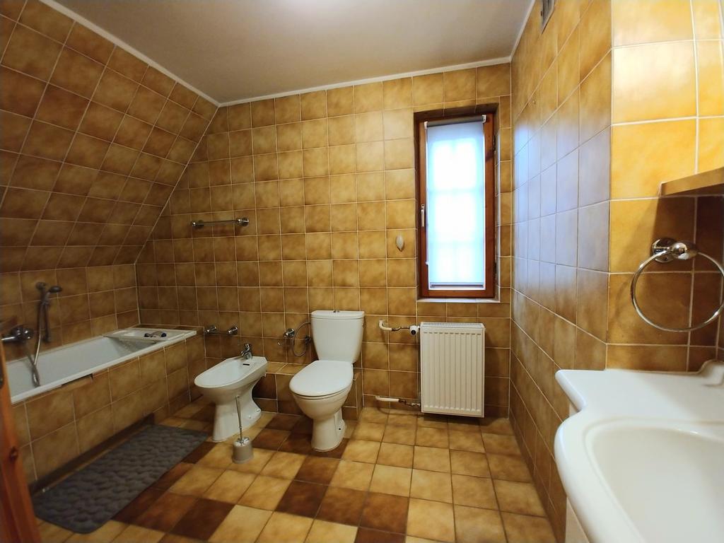 Piętro: 3 pokoje, łazienka (wanna, umywalka i wc), garderoba i przedpokój.