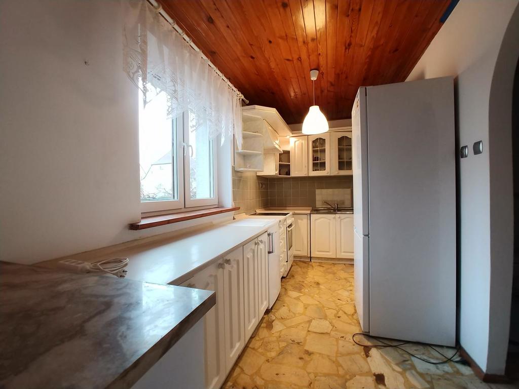 Parter: duży salon z aneksem kuchennym, pokój, łazienka z wc, umywalką i prysznicem, wiatrołap. Kuchnia widna z oknem otwarta na salon, wyposażona ze sprzętem agd.