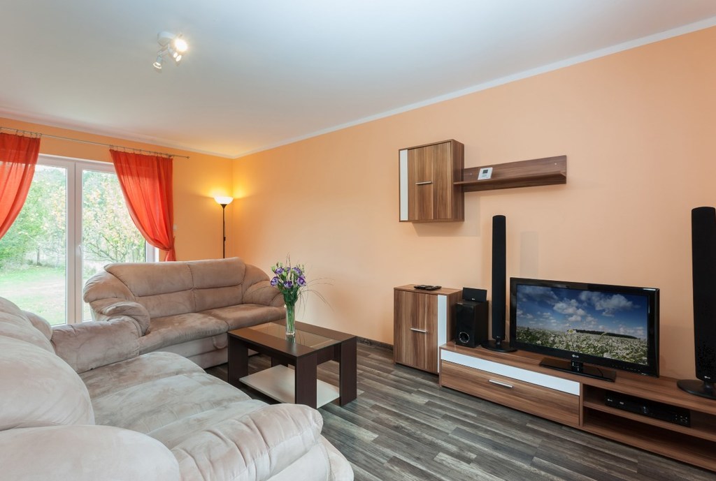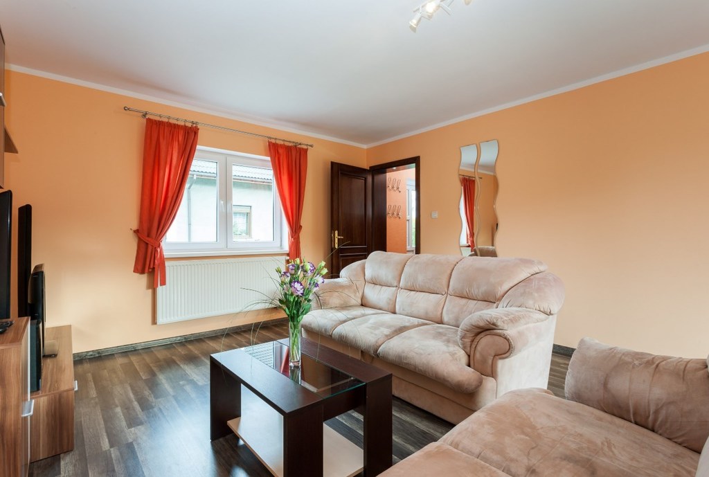 2 rozkładane sofy, stolik do kawy, szafki, kominek, sprzęt RTV i AGD, wyjście na otwarty taras