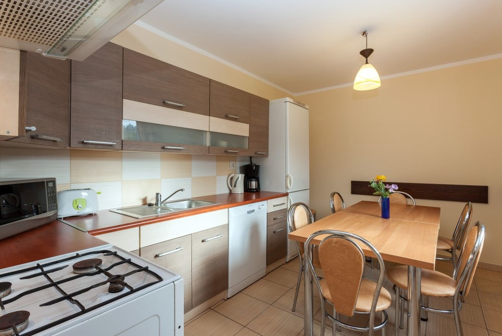 Stół z 6 krzesłami, zmywarka do naczyń, czajnik, ekspres do kawy, toster, kuchenka mikrofalowa, lodówka z zamrażalką, kuchenka z piekarnikiem, szklanki, zestaw garnków, sztućców, patelnia