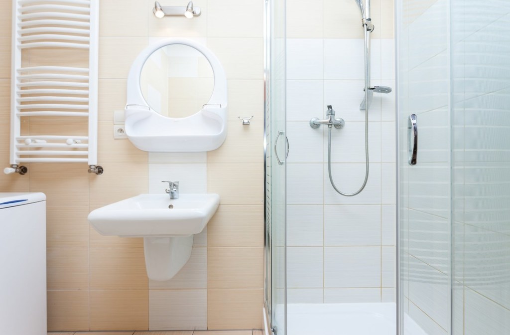 Prysznic, WC, umywalka, suszarka do włosów, lustro, ręczniki, pralka