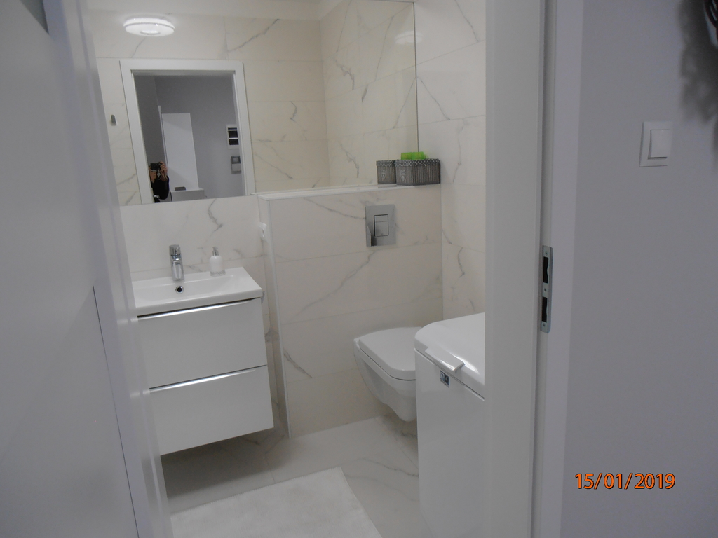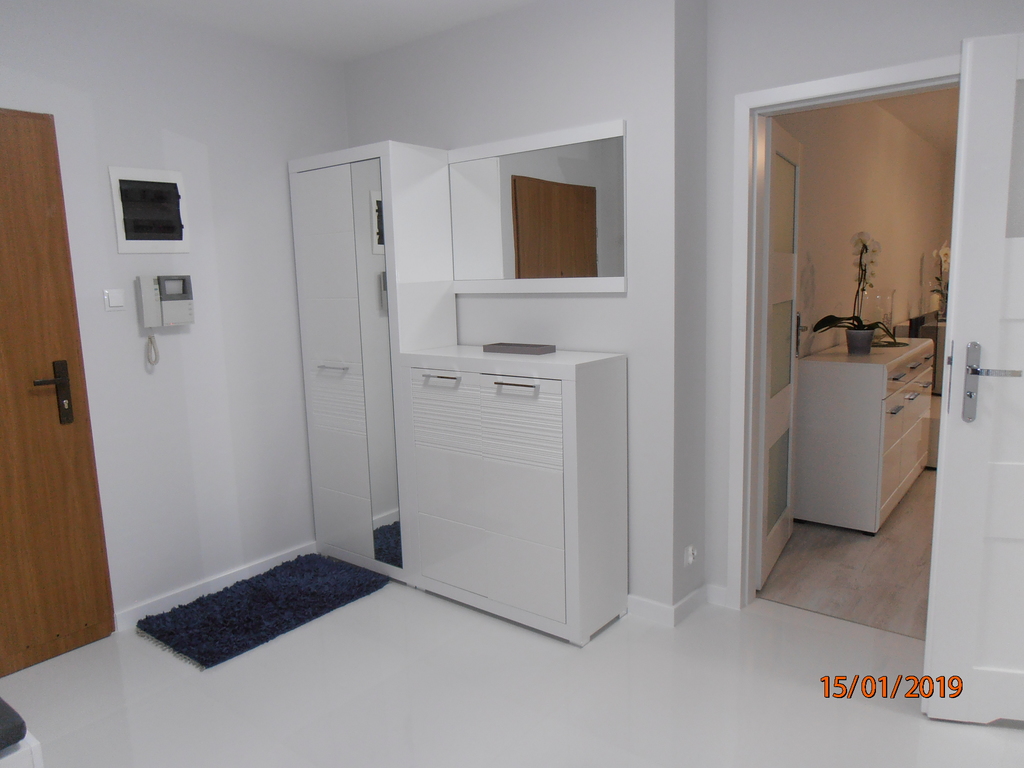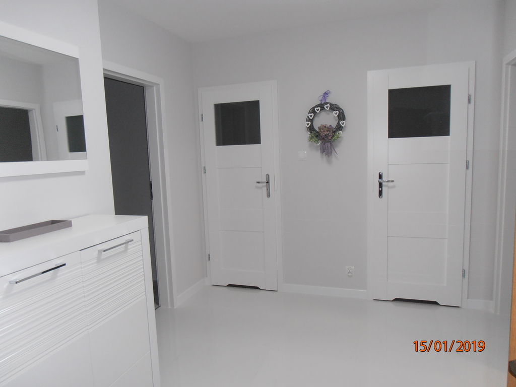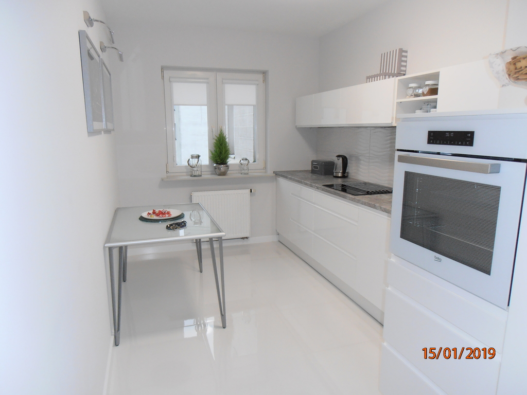 W pokojach na podłodze panele, ściany gładzone i malowane. W pełni umeblowane i wyposażone. Łazienka z kabiną prysznicową, w glazurze i terakocie, w łazience pralka. Kuchnia wyposażona w lodówkę, piekarnik, , stół i krzesła, zestaw naczyń i sztuców.