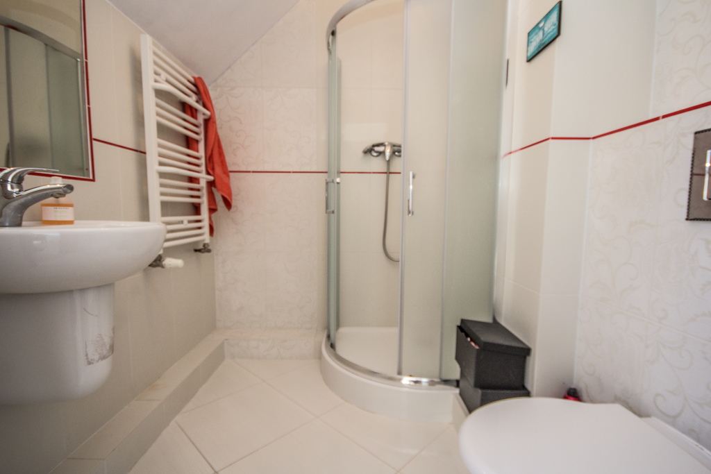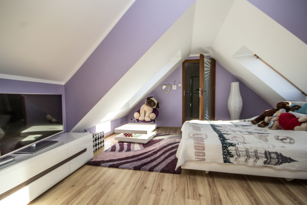 -przestronny pokój z łazienką. Prowadzą do niego piękne, oświetlone schody.