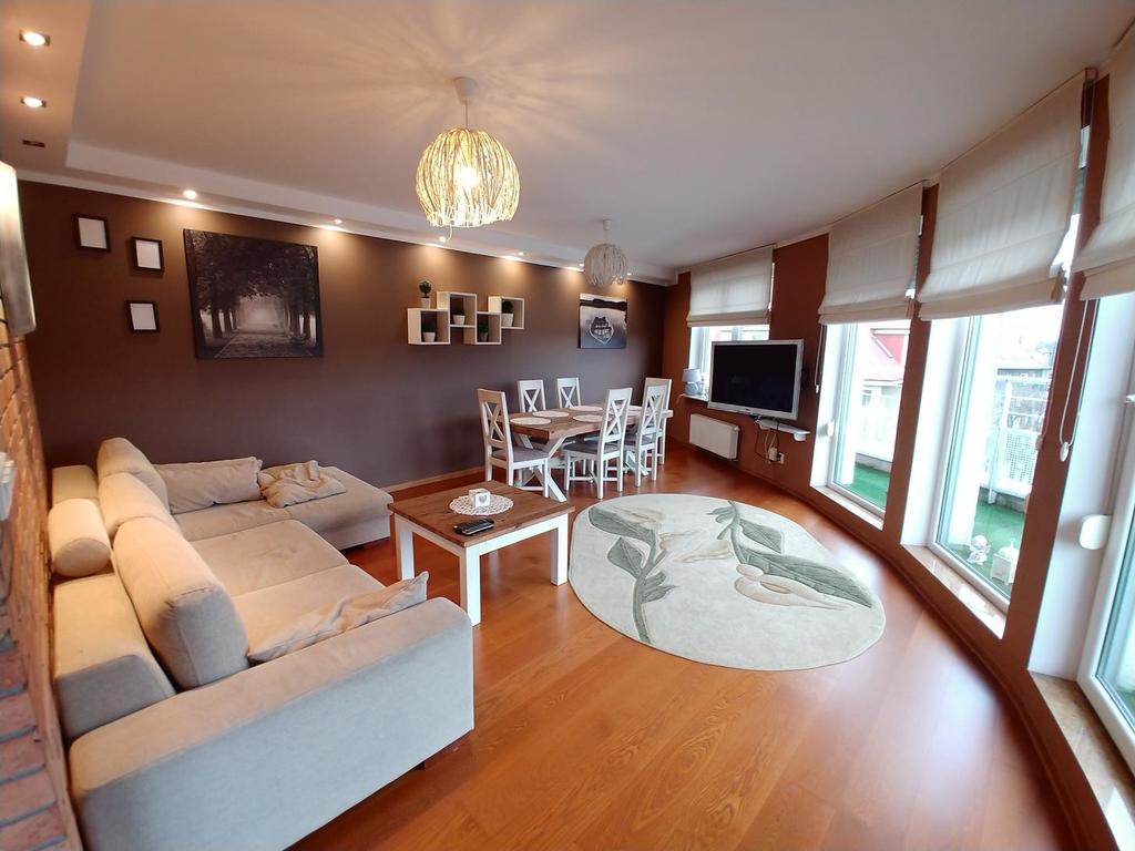 Na powierzchnie 85 m2 składa się oryginalny salon z jedną ze ścian w kształcie łuku, z oknami francuskimi i panoramicznym widokiem na miasto. Dodatkowym atutem salonu jest biokominek i wyjście na taras ze sztuczną trawą o powierzchni 20 m2 (ekspozycja wschodnio-południowa). W salonie duży i wygodny wypoczynek, 50 calowy telewizor, drewniany 6 osobowy stół w stylu prowansalskim.
