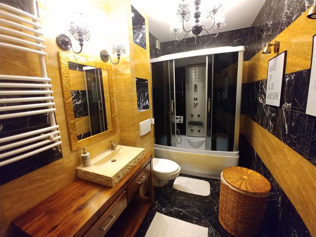 Na podłodze deski, granitowe płytki, plastikowe okna. Apartament jest w pełni wyposażony i umeblowany, z dużą ilością szaf, półek na odzież i bieliznę. Na życzenie, mieszkanie może być dodatkowo doposażone.