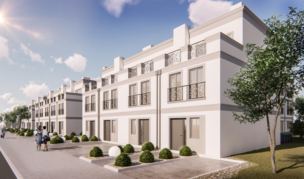 Domy wybudowane w zabudowie szeregowej każdy o powierzchni 100 m2.