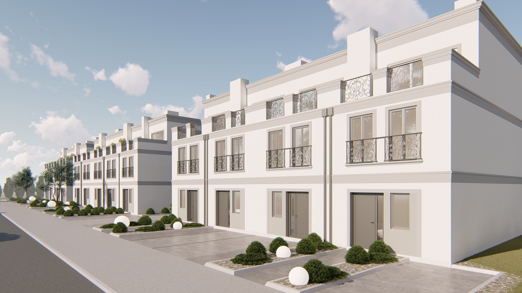 Domy wybudowane w zabudowie szeregowej każdy o powierzchni 100 m2.