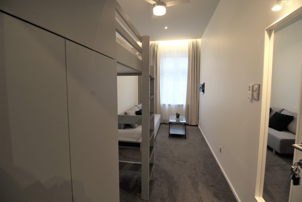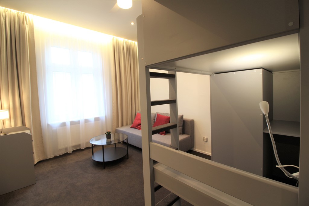 - 3 oddzielne pokoje - w każdym pokoju antresola z łóżkiem i szafą oraz rozkładana kanapa,