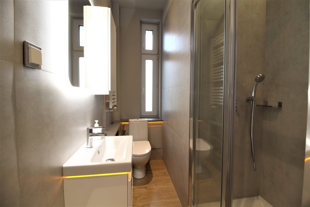 - 2 łazienki (pierwsza z prysznicem i wc, druga z wanną i wc),