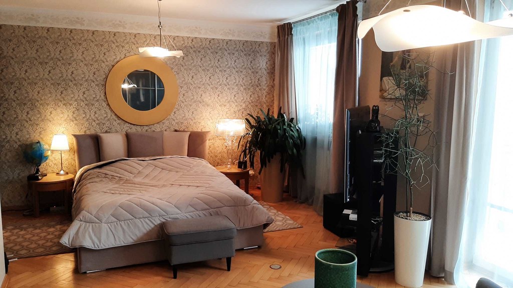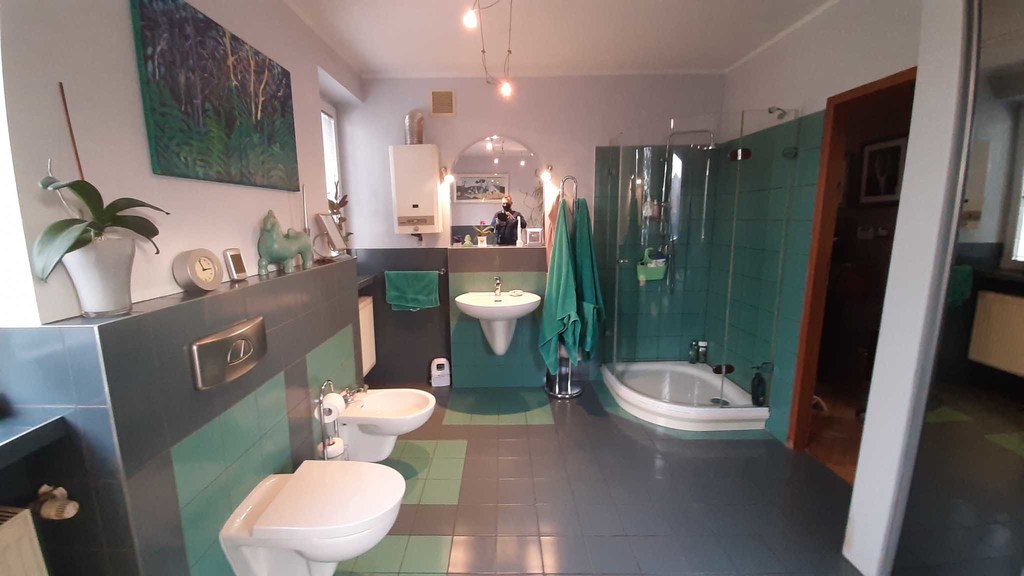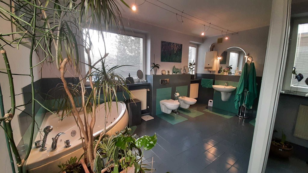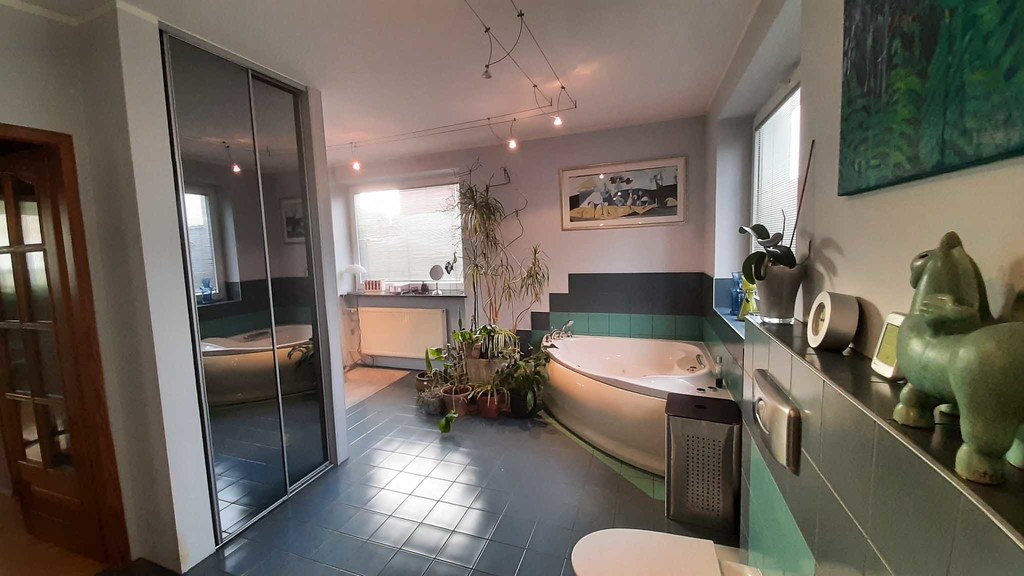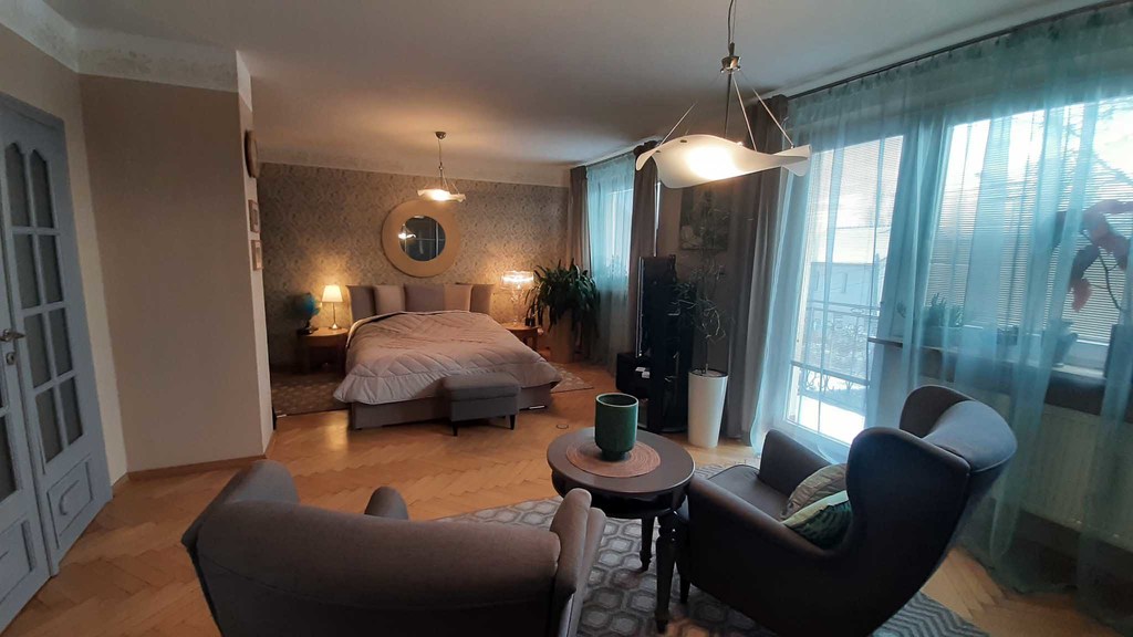 * pierwsze piętro: duża , jasna sypialnia (pierwotnie były to dwa niezależne pokoje obecnie połączone) z balkonem od strony południowej, oraz przestronny pokój kąpielowy z wanną z hydromasażem, kabiną prysznicową , toaletą, bidetem , toaletką oraz systemem szaf. Pokój kąpielowy również powstała z połączenia z pokojem.