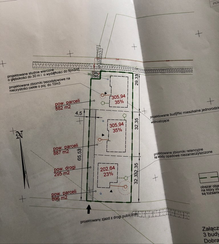 Działka o powierzchni 2958 m2 z warunkami zabudowy na 1 dom wolnostojący i dwa domy dwulokalowe.