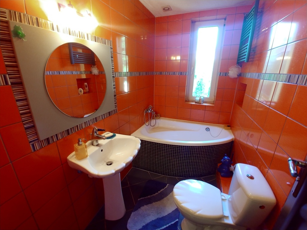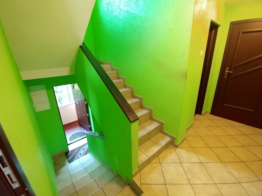 W całym domu ściany gładzone malowane, na górę prowadzą drewniane schody wylewane, wyłożone terakotą. W pokojach panele. Wszystkie pomieszczenia mają okna pcv. Ogrzewanie piecem z podajnikiem na ekogroszek, ciepła woda użytkowa z zasobnika 200L.