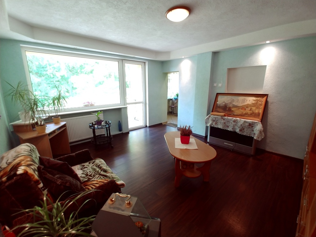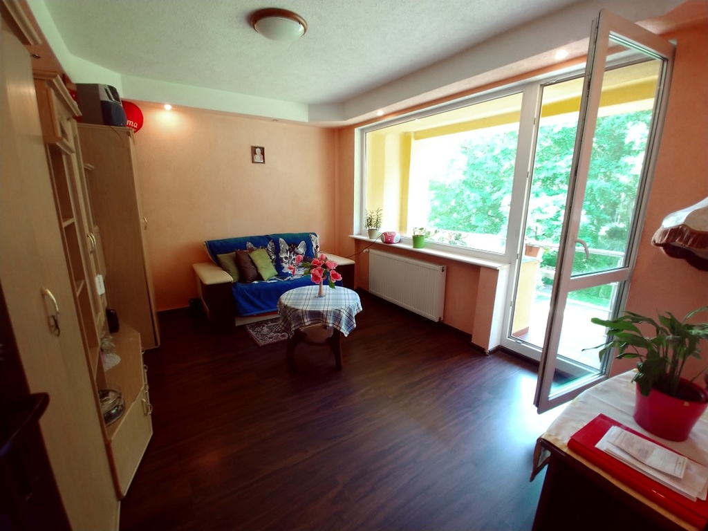 Parter (od strony ogrodu poziom "0", od frontu piętro pierwsze): na tym poziomie znajduje się kuchnia z oknem, salon z wyjściem na balkon, duży pokój z możliwością podziału na dwa, łazienka z wanną i wc.